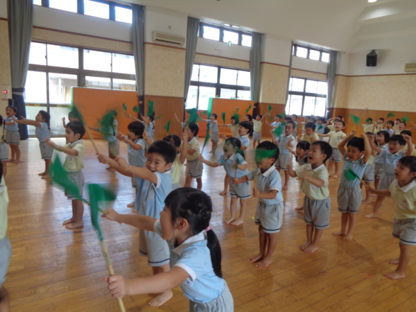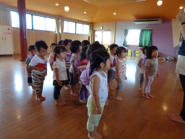 二歳は、気をつけや帽子の着脱の練習をしました。