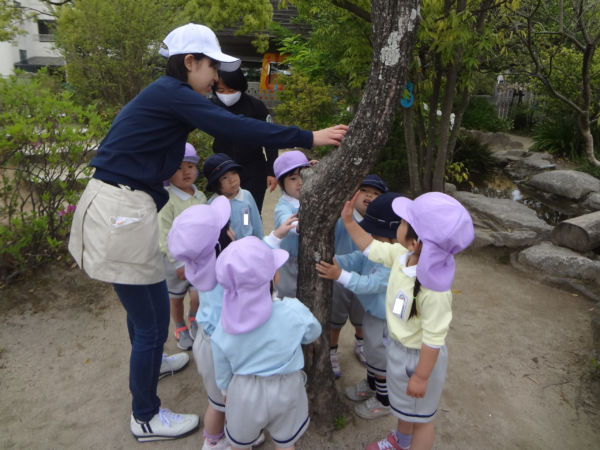 みんなの森にある「ナツメ」の木に興味津々の子ども達。