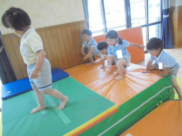 マットを一生懸命に登ったり、上からジャンプしたり…