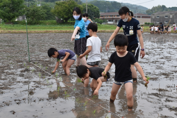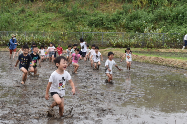 泥を掛け合い、先生達と相撲して全身泥だらけ。