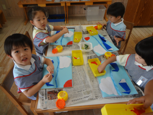 雲や太陽を貼って気持ちよさそうに泳いでるクジラができました!