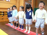 「ひげじいさん」「ドレミ体操」「かえるの歌」など、音階を歌いながら子ども達がピョンピョン動いていきます。説明を一回すると、すぐに覚えて動けるようになってきました。