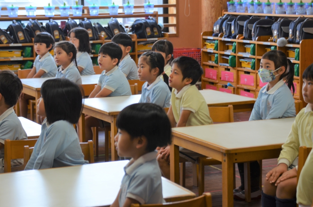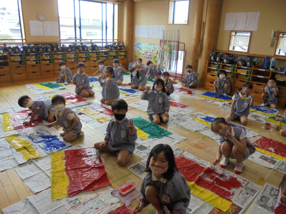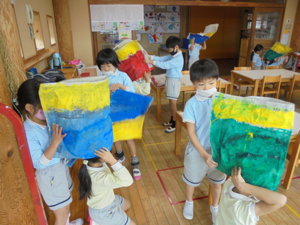 自分で好きな絵や柄を描いた凧を園庭で飛ばすと