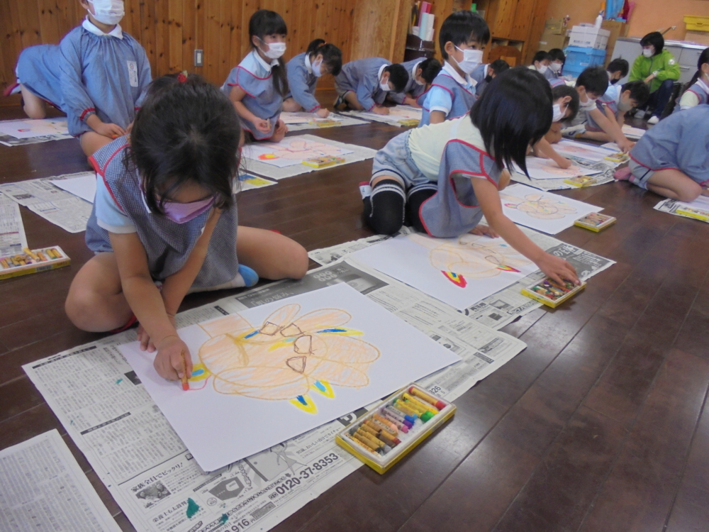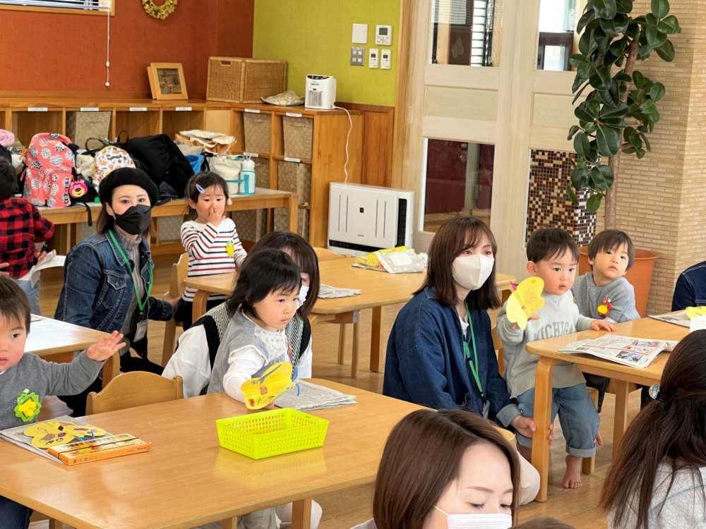出来上がったちょうちょうで遊ぶ子ども達が、