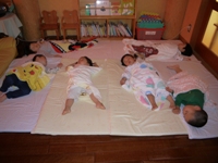 お腹もすいたところで、給食。そして、つぼみのみお昼寝の時間。沢山遊んで、ぐっすりの子ども達。時々、寝言もいい、夢の中でも元気いっぱいの様子です。