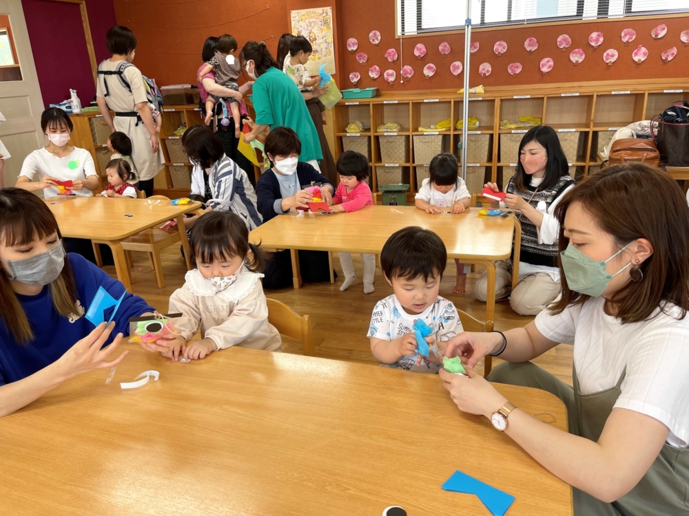 製作では、小さな手で花紙を丸め『こいのぼり』を作りました。