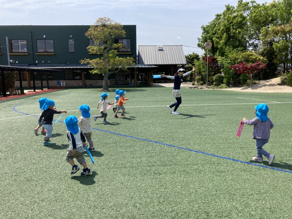 園庭にある鯉のぼりや空を飛んでいる飛行機に