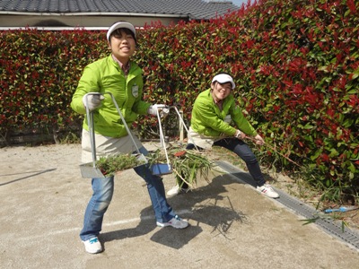 草取り・掃除をしました。(写真右の河津先生の腕、焼けて色が違うグラデーションに!!)