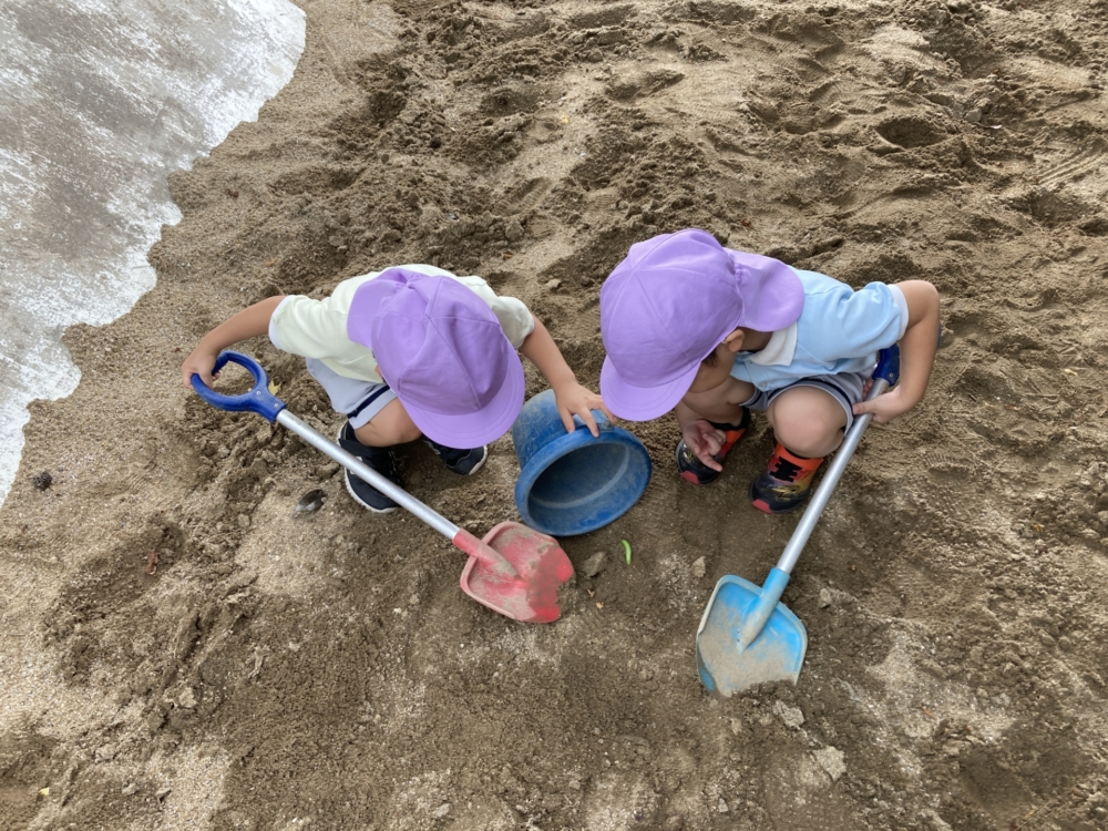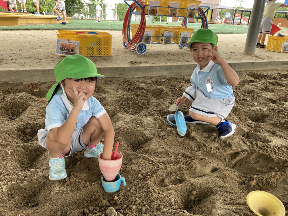 砂場で一緒に遊ぶ子ども達。