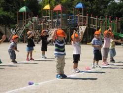 そして、今日の子ども達も外で元気いっぱいです。外でかけっこ、そして遊戯をしました。子ども達の大好きな曲に合わせて踊りました。広い園庭ですが、小さい身体を大きく動かして踊っている子ども達です。