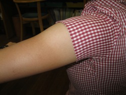 夏の風物詩(!?)、Tシャツ焼け\(◎o◎)/!これは、一年目S先生の二の腕です。くっきりはっきりとまではいきませんがいい感じで自然のお洋服をきていますよね(笑