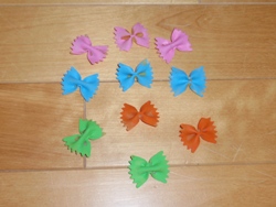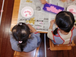 今日は、絵の具遊びをしました。いつもは、紙に塗っているのを今回は、なんと「マカロニ」に塗りました。それもリボンの形をしているので、初めて見た子ども達は、大喜び!!「早く塗りたい」と言っていました。塗り始めると一気に静かになり、とても集中していた子ども達でした