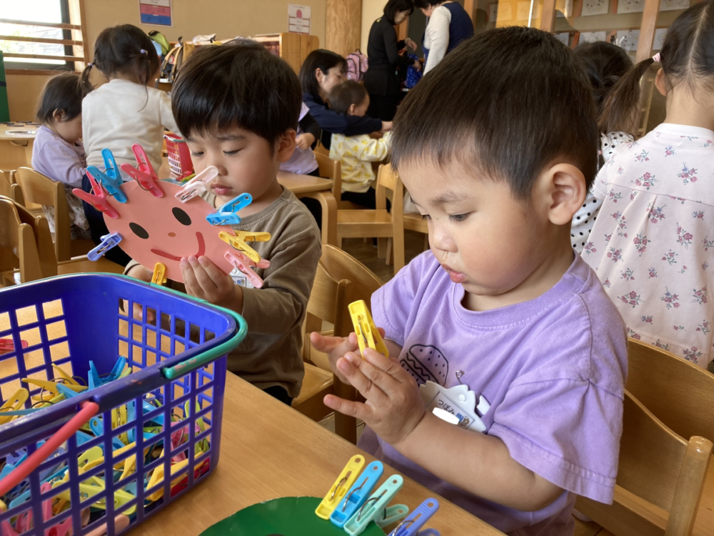 二歳は洗濯ばさみで挟んでライオンを作りました。