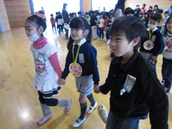 ペアの1年生のお兄さん、お姉さんにメダルをもらったり、一緒に「さんぽ」を歌ったり、
