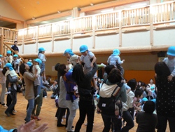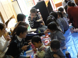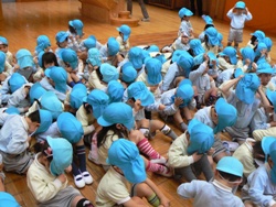 なにやら帽子の日よけを前にして座る子ども達・・・