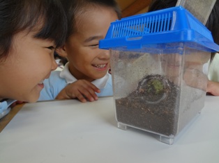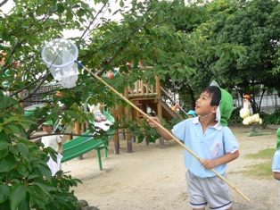 今、自由遊びの時間に子ども達が虫網と虫カゴを借りて
