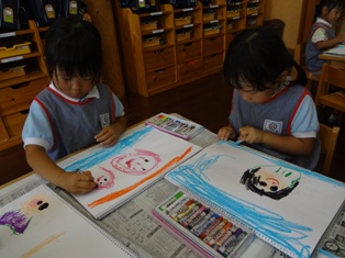 今日の年少は「夏休みの思い出」をパスで描きました♪