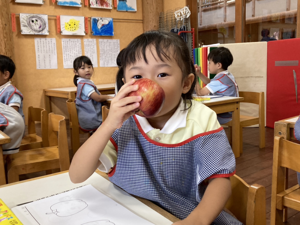 りんごを見たり触ったりして