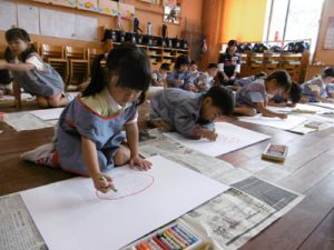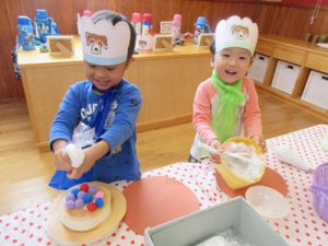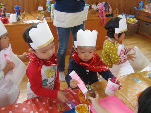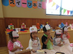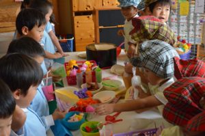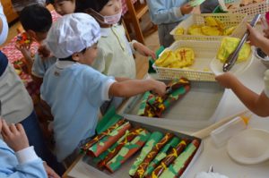 画用紙に大きく「ハンバーグ」や「ソーセージ」を描いて…