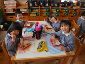 給食の時間は、楽しく友達と会話を楽しみながらも、