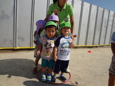 フープ遊びでは鬼につかまらないように走って中に入っています。