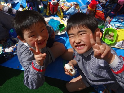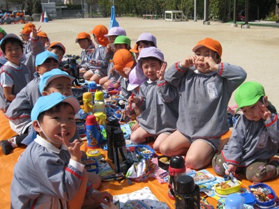 園庭と2階のデッキに分かれてピクニック気分で食べました♪