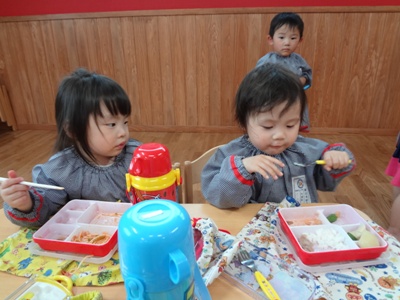 給食は、「これ何」と言い興味を持ちながら
