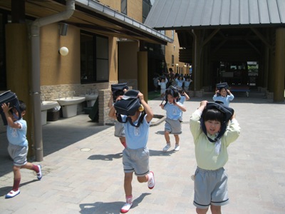 放送をよく聞いて・・・机の下に隠れて身を守ります。