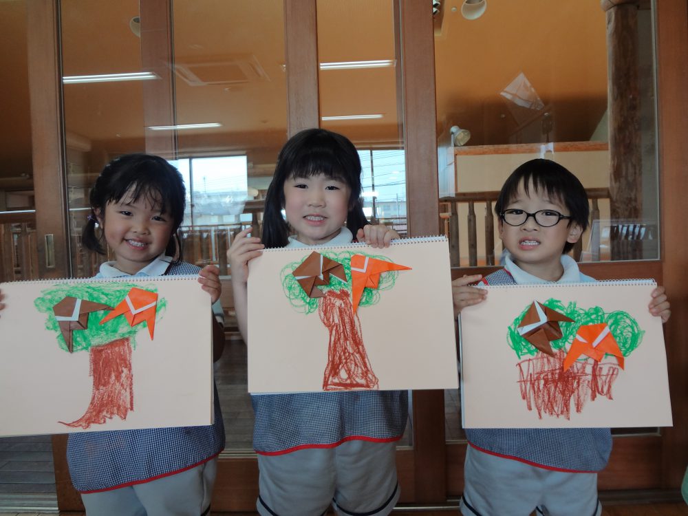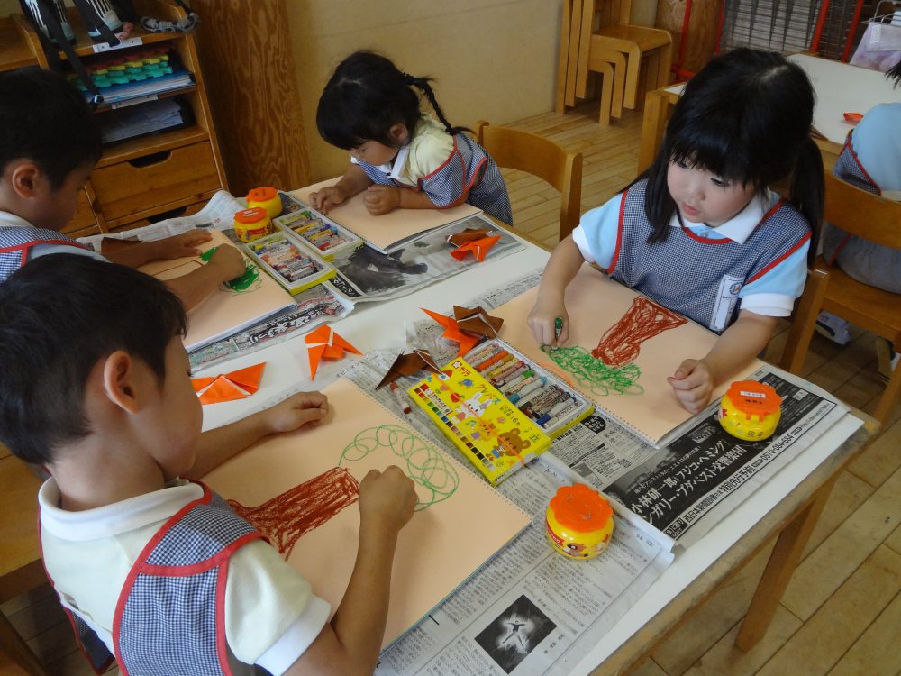 折り紙を折って・・・パスでぐるぐる、木を描いて・・・