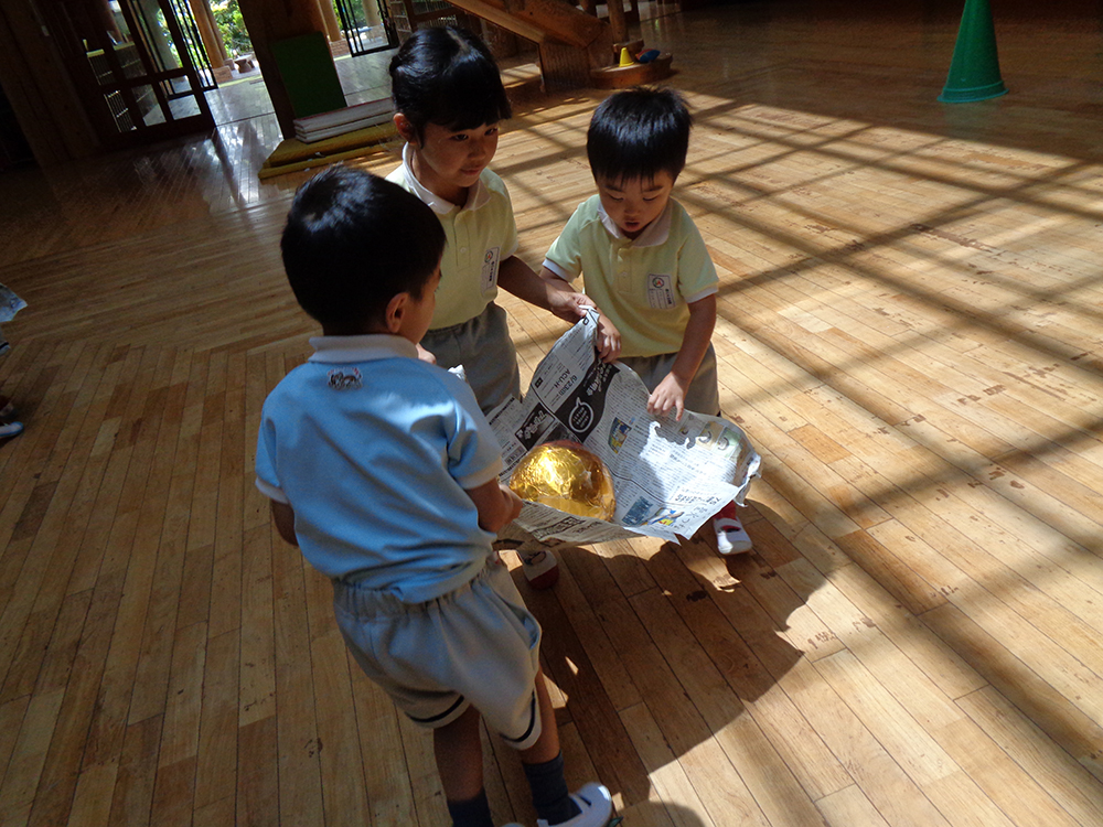 キンダーホールでは、三学年で協力して新聞を使ってボールを運んでいました!