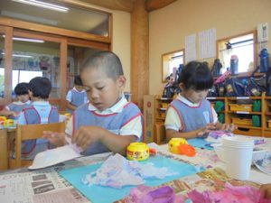 絵の具で染めたキッチンペーパーをちぎって…