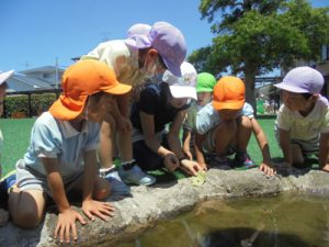 遊んでいると、池の所に人だかりが…!