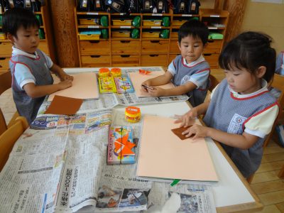 そして、年中組は折り紙を使い