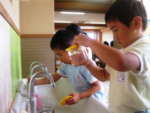 一人一つサフランの球根をもらい、慎重に水を入れていました☆