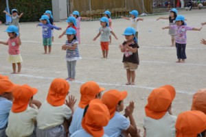 年中組リズム組体操は、素早い動き・力を入れた気をつけ・そして最後の一本橋!