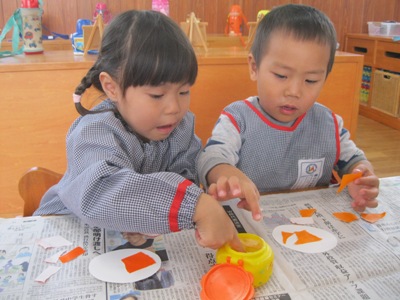 オレンジの折り紙をちぎり、のりで貼って