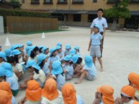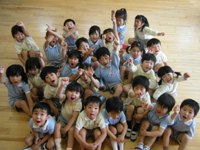 こんにちは。最近暑い日が続いていましたが、今日は気持ちの良い風が吹き、過ごしやすい1日でしたね。今日は・・・体操での素早い動き、大きな声、かけっこで真剣に走る姿…そんなかっこいい年長の「パワー」を年中の友達がもらってきました!!年長と年中、1クラスずつで一緒に体操とかけっこをしましたよ。その中で、我がクラスこすもす組とにじ組の様子をお伝えします。