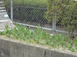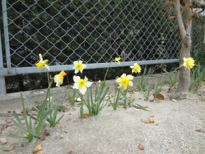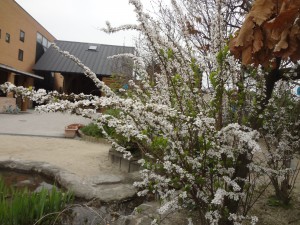 4月、春満開の園庭で元気な森っ子が遊ぶのが