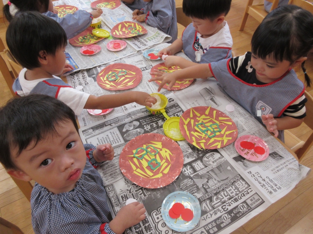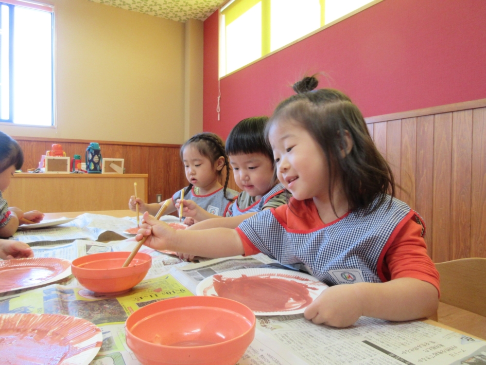 つぼみ組は絵の具を塗ってトッピングをペタペタ