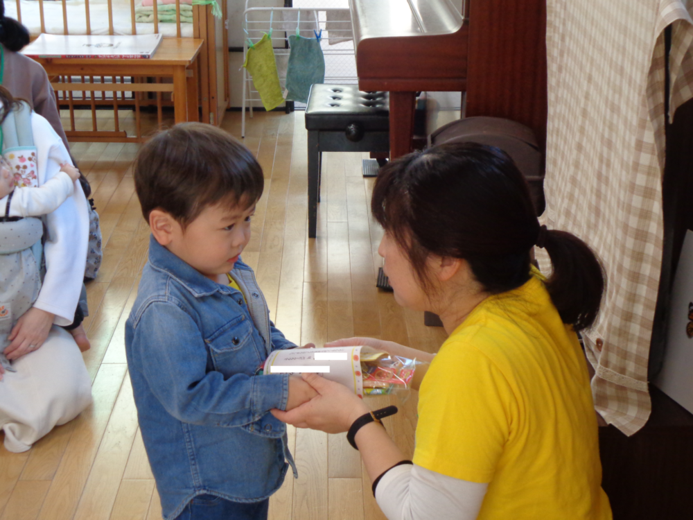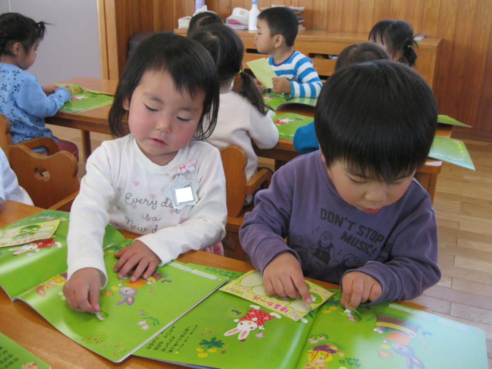 さて、二歳児は『ブック』で、春の花や虫のシール貼りをしましたよ