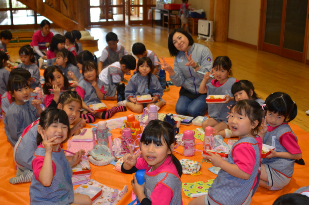 最後の給食はキンダーホールで4クラスで食べましたよ!