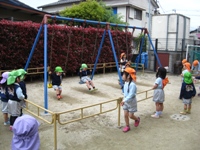年少の子ども達は昨日園庭探検を年長のお兄さん、お姉さんと一緒に行きました。そのこともあって、さっそくお兄さん、お姉さん達が年少の子ども達を誘ってくれて、手を繋ぎ、仲良く遊んでいる様子を見て、微笑ましかったです。