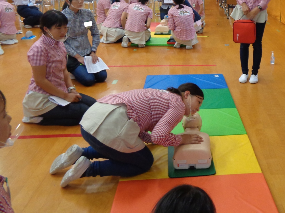 万が一に備えて、心肺蘇生法の仕方やAEDの使い方を教えてもらいました。