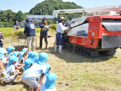 人間が汗水流して行う稲刈りをものの数十秒で終えてしてしまい、手品のように稲が消えていく様子に、子どもや教師から「おぉ~!!!」と拍手と歓声が(笑)