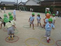 ・・・けんけんぱ?と思いきやまさかの色つき鬼です\(゜ロ\)(/ロ゜)/色とりどりの輪っかをあっちに走りこっちに走り、とても楽しそうでしたよ。