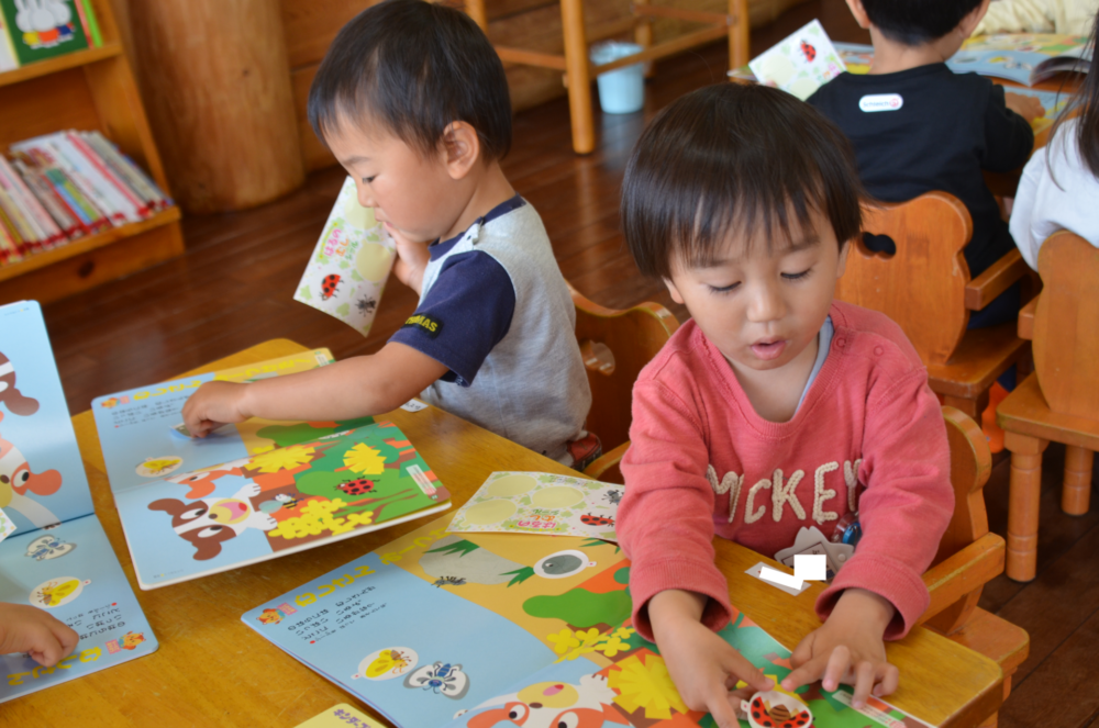 月間絵本の『じゅにあ』では、春の虫のシール貼りをしました。