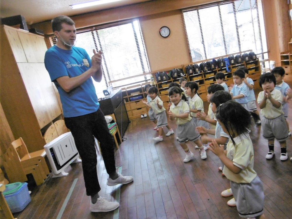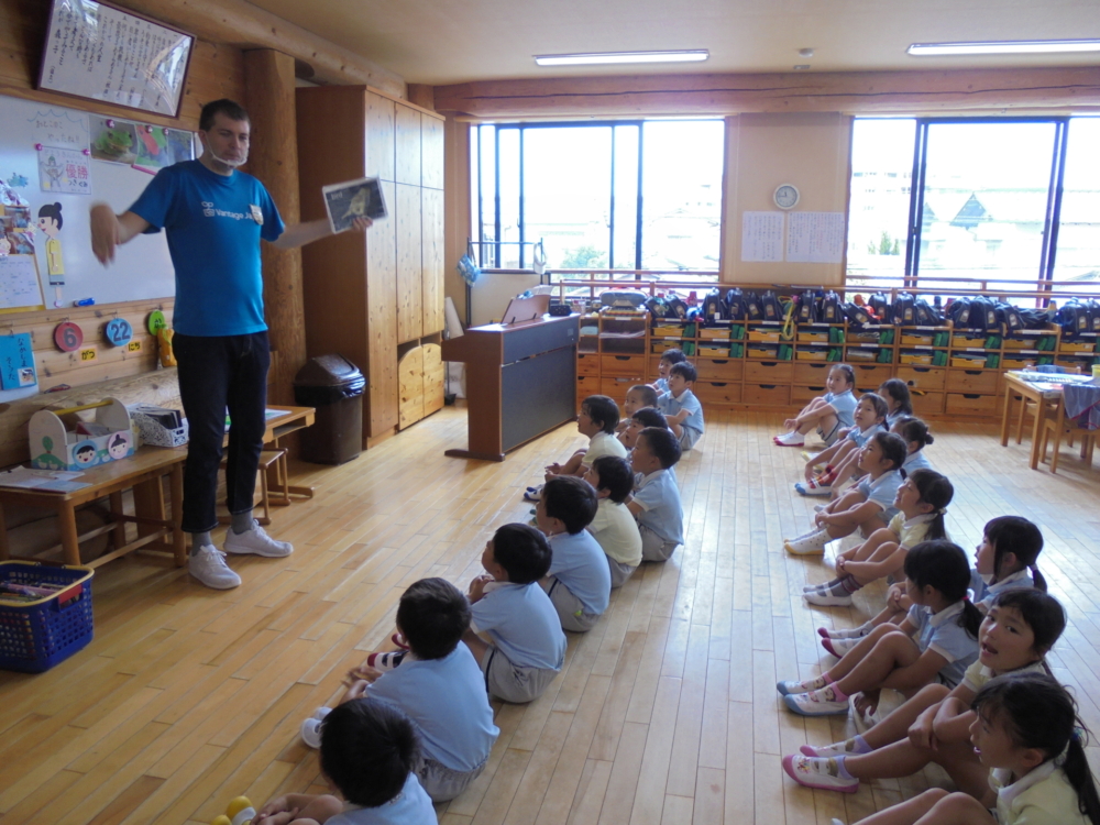かっこいい体操座りでディラン先生の話を聞いていますね。