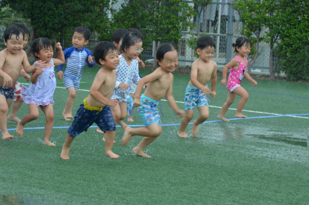 スプリンクラーの上を楽しそうに走り回っていますね。