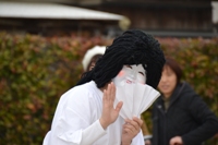 各クラス素敵なお面をつけて、園庭で豆まきをしようとすると・・・