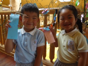 笹に飾り付ける時は、こんなに真剣に結びつけていました☆